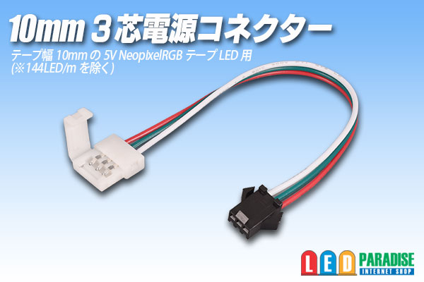 テープ幅10mmの3芯式NeoPixelテープLED用の電源コネクターです。